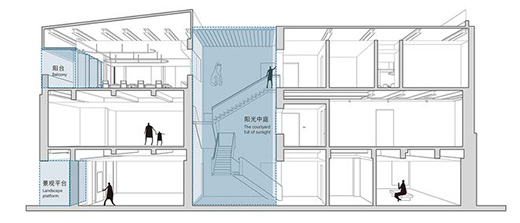 路易斯·康说「自然光给予了空间特性,也给予了建筑生命。建筑的生命由光的照射而产生。基于此,除非给予建筑生命,否则没有一个空间是真实存在的。」设计师的思考由此展开。在项目的整个设计中,可以说“光”参与了空间的创造与再组织。面对现状建筑,设计师决定保证原有建筑结构的完整性,同时适当地减去不同尺度的矩形体量以形成丰富的空间形式和层次,给光创造多尺度和多维度的引入空间,使光影与空间产生无限的可能性。