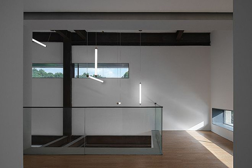 二层西侧的半通高侧庭使光线经过天窗渗透到室内,产生的光影与纯白墙面形成强烈的对比,仿佛在展厅内置入了一个流动的“光体块”。时间的变化为光影带来无限可能,打破了空间的定格,为空间创造了深度。当人们置身展厅在艺术品前或省思或交流的时候,光线似乎与时光一起始料不及的流过。