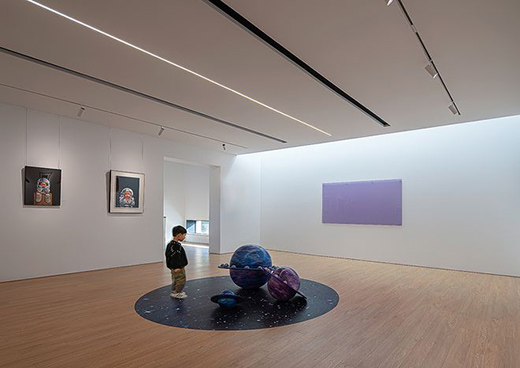 作为美术馆次要空间的过道,设计师并没有过多地做隐蔽处理,而是将其打造为展厅的延续。交通空间围绕中庭展开布置,投影灯在过道白墙上映射出的绚烂光影,让人在不经意间已互动其中。过道串联起各个展厅空间,它保证了人们在观展过程中的连续性体验。