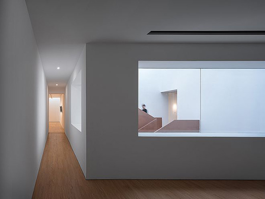 室内光井将公共空间向上延伸,洒落的光线与室内灯光不期而遇。光线的丰富层次为空间增添几分灵动与张扬。设计用素混凝土和白色涂料两种简单却反差极大的材料,给展厅空间与公共交通空间创造了视觉边界。