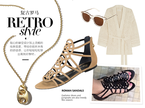 裸色系的开衫是换季时节当仁不让的人气之星,怎么搭都会有自成一派的风格。偏爱大气的女孩不如戴上复古味十足的棕色墨镜和金色饰链,让每一处都不平凡!当然,最瞩目的仍然是脚下那一双复古罗马鞋,镂刻着独一无二的张扬个性。