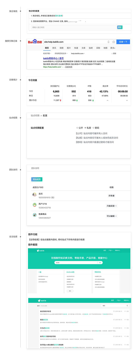 团队协同方便内部问题的添加,同时加入站点权限的功能,让你的FAQ页面针对指定人群开放。全文检索更是方便了内容的查阅!
